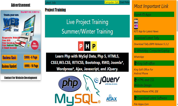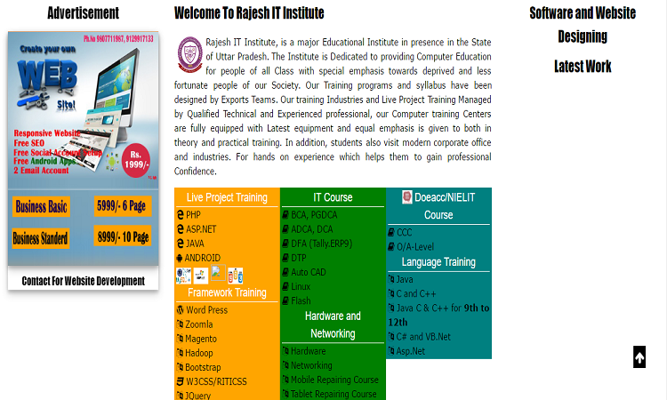 Rajesh IT Institute, is a major Educational Institute in presence in the State of Uttar Pradesh. The Institute is Dedicated to providing Computer Education for people of all Class with special emphasis towards deprived and less fortunate people of our Society. Our Training programs and syllabus have been designed by Exports Teams. Our training Industries and Live Project Training Managed by Qualified Technical and Experienced professional, our Computer training Centers are fully equipped with Latest equipment and equal emphasis is given to both in theory and practical training. In addition, students also visit modern corporate office and industries. For hands on experience which helps them to gain professional Confidence.